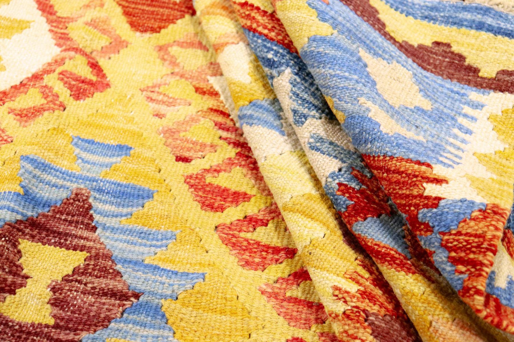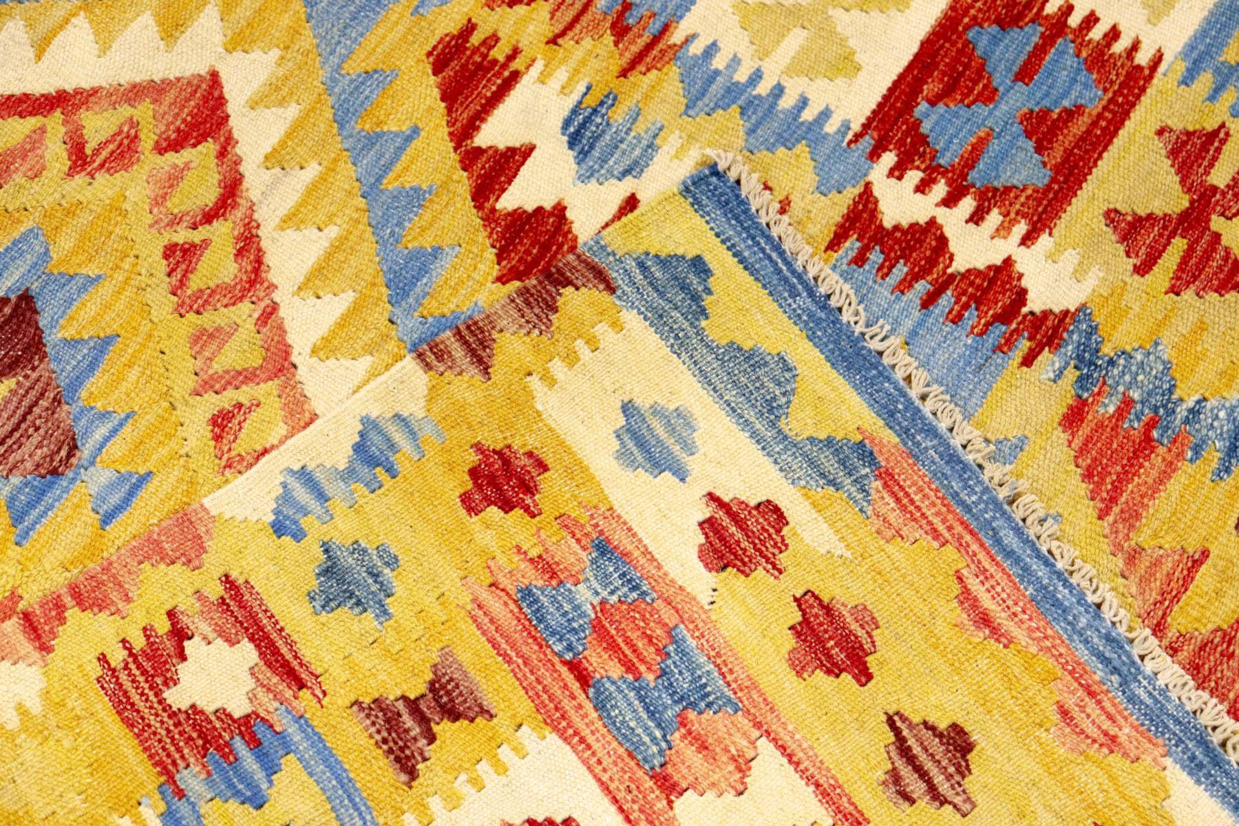 Kilim rugs have their roots in the late 19th century and enjoy a long tradition in the Orient. They are woven by hand and are characterised by their flat structure. In contrast to the elaborately hand-knotted traditional oriental rugs, kilims offer the advantage of being used on both sides, as the front and back look identical. They are made with warp and weft, using sheep's wool as the main material. Sheep's wool is extremely hard-wearing and also provides excellent thermal insulation. Kilim rugs are known for their vibrant colours and add an atmosphere of vibrancy and joy to any room.