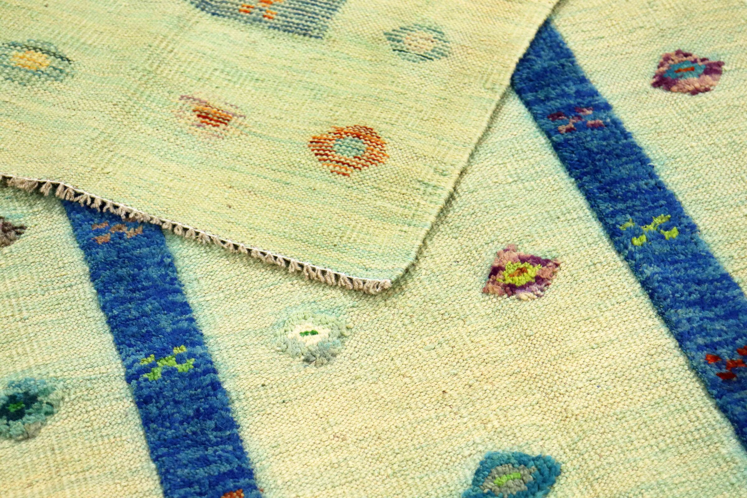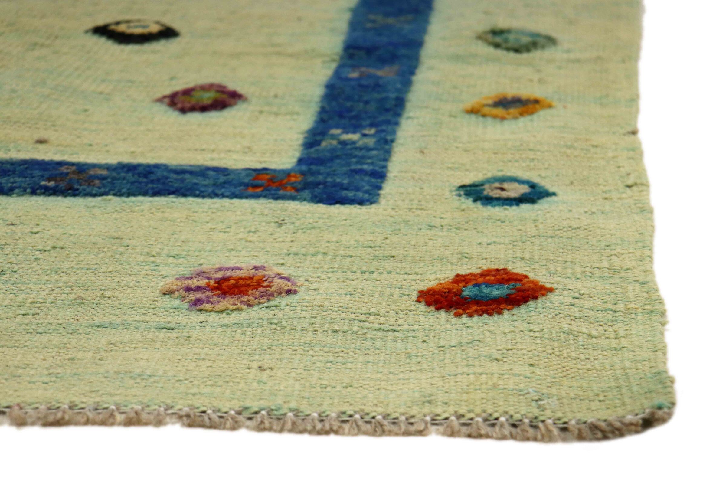 This carpet is made as a flatweave by hand on looms instead of being machine-made. Unlike traditional high pile carpets, flat weave carpets do not have thick pile fibres and are instead woven flat or very flat. This type of rug is often prized for its versatility and sleek, modern appearance. Flat weave carpets are a popular choice for those looking for a durable and stylish floor covering that suits a variety of interior styles.